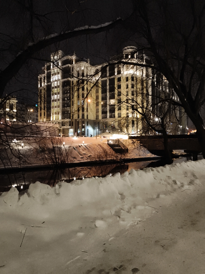 A nighttime view captures a tall building with illuminated windows, framed by bare tree branches. Snow covers the ground and lines the edge of a waterway, its surface reflecting the building's lights. A bridge spans the water, and the overall scene suggests a cold, urban environment. The perspective is low, emphasizing the height of the building against the dark sky.