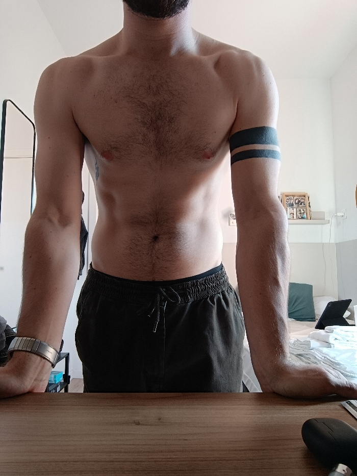 - "The image depicts the bare-chested torso of an adult male, visible from the mid-thigh area to just below the neck" by FM-963E53, licensed under CC BY 4.0