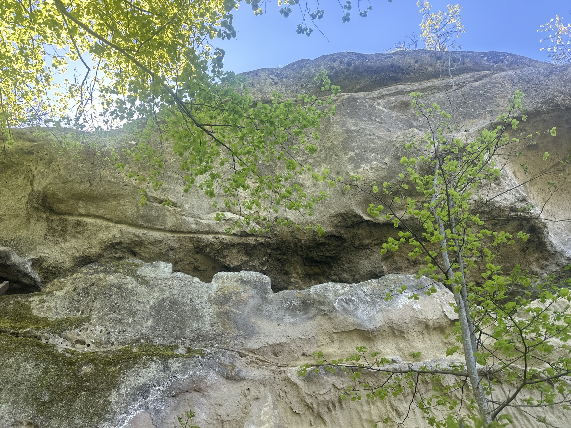 rocky cliff face with some trees growing near it, possibly located in the city of Blaskovo, Bulgaria