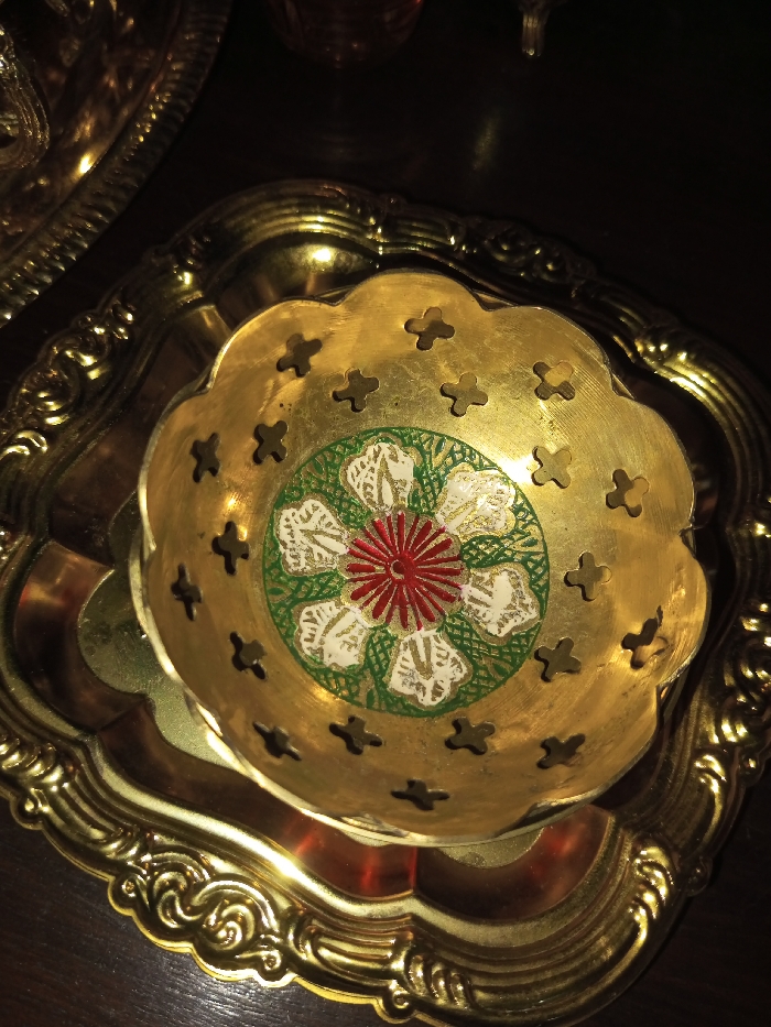 A small, ornate golden bowl sits atop a larger, square, golden tray. The bowl features a scalloped edge with cross-shaped cutouts, and a floral design in the center with red, white, and green details. The tray, also golden, has an elaborate, raised rim. The lighting is dim, casting shadows across the items. A blurred golden dish is partially visible in the upper left corner.