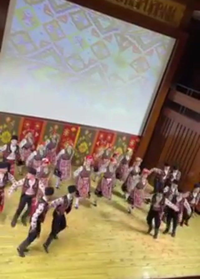 A wide-angle shot depicts a folk dance performance on a wooden stage