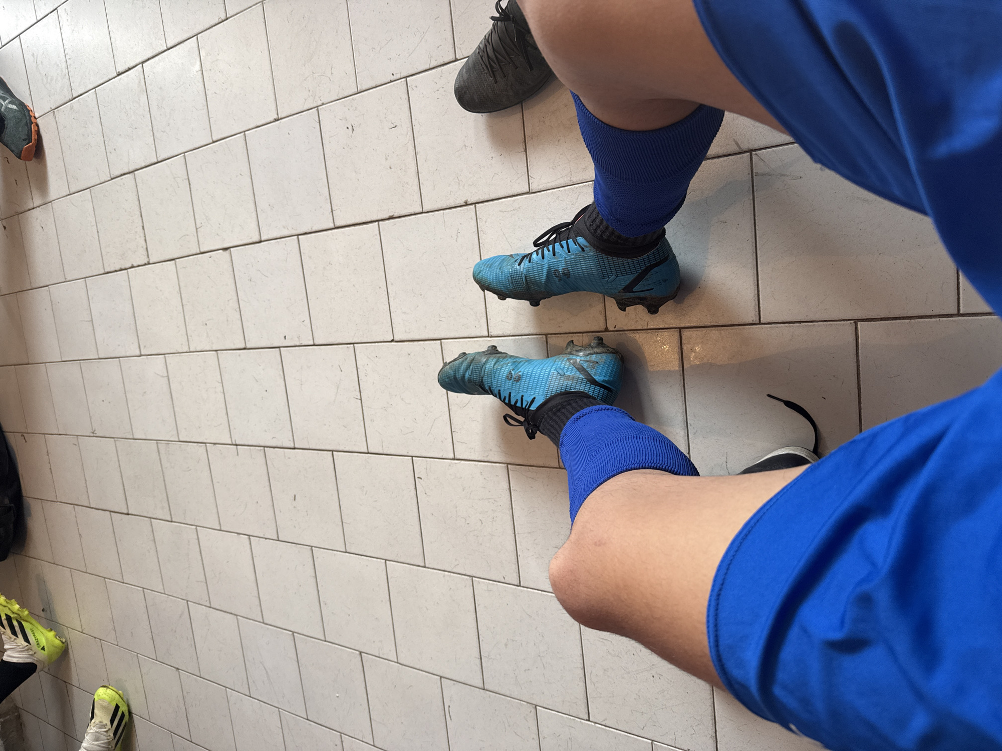 tiled floor, likely in a locker room. Four pairs of feet wearing athletic shoes or cleats are visible. One individual is wearing blue socks and a blue athletic uniform. Another individual is wearing black shoes and grey socks. Two other pairs of shoes are partially visible, one with yellow and green stripes, and another with orange accents. The location in Kaspichan, Bulgaria is not identifiable from the image.