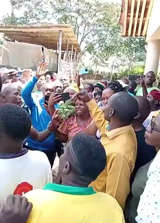 A crowd of people are gathered outdoors. Most of the people in the foreground are facing towards someone out of frame. Many are holding up cell phones, apparently recording. The people appear to be of African descent. Many are dressed in yellow shirts. Some are wearing head coverings. Behind the crowd is a building with a white exterior. A corrugated roof and wood structure are partially visible to the left of the building. Trees are visible above and behind the building. One man in a yellow shirt appears to be speaking.