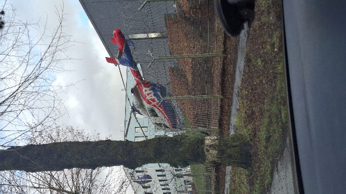 The image depicts an outdoor scene in Sandweiler, Luxembourg, captured from inside a vehicle, evidenced by the dark dashboard visible at the bottom. In the foreground, a moss-covered tree trunk stands vertically on the left, with bare branches extending into an overcast sky. A dark, damp ground surface, possibly asphalt or packed dirt, is visible around the tree base. In the midground, a gray wire mesh fence runs horizontally across the frame, separating the foreground from the background. Behind this fence, a large pile of brown, dried foliage or wood chips is present. Beyond this, a red, white, and blue helicopter, clearly marked with "LAR" (Luxembourg Air Rescue) in red lettering on its fuselage, is visible. The helicopter's main rotor blades are retracted or blurred, and its red tail rotor and stabilizer are prominent. In the background, behind the helicopter, two buildings are apparent. The left structure is a multi-story, light-colored building with multiple windows and at least two flags flying from poles near its entrance, one appearing to be the European Union flag. The building on the right is a large, dark grey structure with a textured or corrugated facade, suggesting an industrial or commercial facility. The sky above is largely overcast with white and grey clouds. No people are visible. The overall environment suggests an industrial or airport-adjacent area.