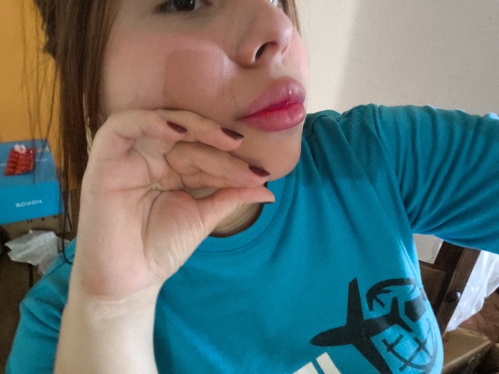The image presents a close-up, chest-up forensic view of a female individual indoors in Juan Griego, Venezuela. The subject has visible red hair and dark eyes, with a light to medium skin tone. Her lips are full, coated in a glossy, vibrant pink-red color. A light-colored adhesive patch is visible on her right cheek, extending from below the eye. She wears a long-sleeved, turquoise blue t-shirt with a partial black and white graphic design visible on the front. Her right hand, with dark red painted fingernails, is positioned against her right cheek and jawline. Her gaze is directed upwards and to the right. The background includes an orange wall section on the left, below which is a light blue box labeled "HONOR" with a small red object resting on it. The right side of the background features a plain light-colored wall and dimly visible dark furniture with white material.