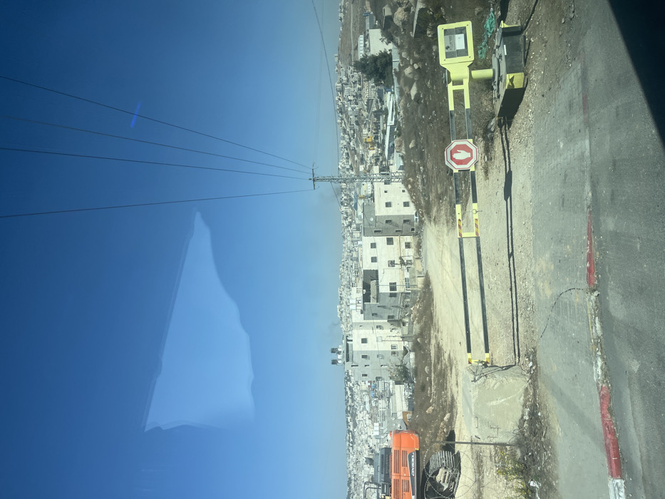 This image displays an outdoor scene in Kiryat Arba, Palestinian Territory, captured from within a vehicle, evidenced by reflections on the glass