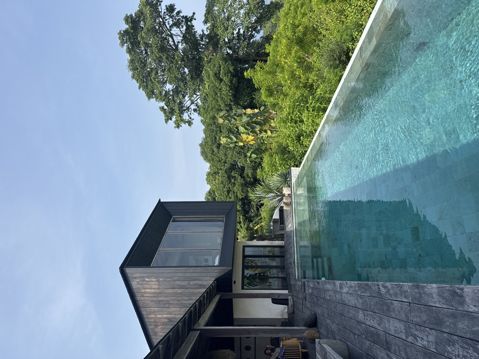 A modern, dark-toned house features an angled roof and large windows, set against a backdrop of lush green trees and a blue sky. An infinity pool stretches towards the foliage, its surface reflecting the surrounding greenery. The pool is bordered by a wooden deck that extends from the house.