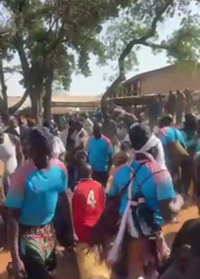 A group of people are gathered outdoors, some dancing and playing drums. The dancers are wearing a variety of clothing, including white tank tops, blue and pink t-shirts, and traditional patterned skirts. The drummers are carrying large, cylindrical drums and beating them with their hands. The crowd is gathered in a dusty area under the shade of trees, with some buildings visible in the background.