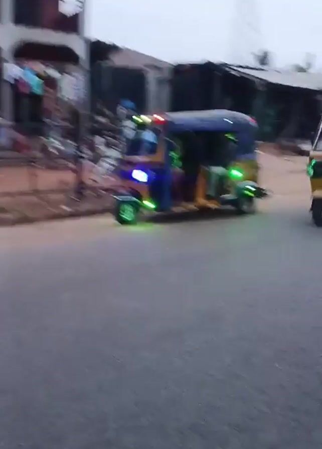 The video appears to have been taken from a moving vehicle in a street in what appears to be a residential or commercial area. The predominant movement is forward, capturing a sense of travel through this environment. The focal point is on the yellow and blue three-wheeled vehicles, commonly known as auto rickshaws or "keke" in some regions. These are prominently featured in the scene, often decorated with lights, adding a touch of liveliness to the surroundings. The environment includes buildings, some appearing to be commercial spaces or shops, and residential structures with clothing lines strung up. This gives a sense of everyday life and the informal economy of the region. There are glimpses of people moving about, but due to the motion of the camera, they are not the central focus. The overall impression is of a bustling area with vehicular traffic and people going about their day.