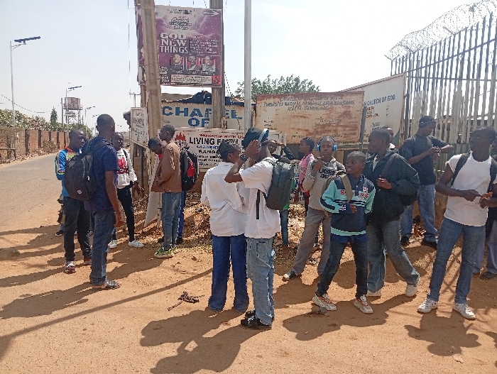 The image depicts an outdoor scene in Barakin Akawo, Nigeria, under clear daylight conditions. Approximately 15-20 individuals, primarily young males appearing to be teenagers or young adults, are gathered on a reddish-brown dirt area adjacent to a paved road. To the left, a paved road is visible, bordered by a low brick wall or fence. Streetlights on tall poles are positioned along this road. In the distant background, a water tower-like structure with a metal framework is visible against a clear sky. In the mid-ground, a cluster of utility poles or signposts stands. Attached to these poles are multiple signs. A prominent vertical sign displays the text "GOD NEW THINGS" in large white lettering, with three portraits of men below it. Another sign below it partially reads "CHAPEL OF..." and further down, "LIVING FAITH". A large, corrugated metal structure, possibly a wall or building, is visible behind these signs, featuring faded text that includes "CHURCH OF GOD". To the right of the scene, a tall metal fence topped with coiled barbed wire runs horizontally, partially obscuring structures behind it. The individuals are dressed in casual attire, including t-shirts, jeans, hoodies, and sneakers or sandals. Several individuals are carrying backpacks. Some are engaged in what appears to be conversation, while others stand observing their surroundings. One individual on the far left wears a dark backpack and stands with his back mostly to the camera. Another individual near the center wears a light-colored top, light-colored jeans, and headphones. Shadows of the people and poles are distinct on the dirt ground, cast towards the lower right of the frame, indicating a high sun angle.