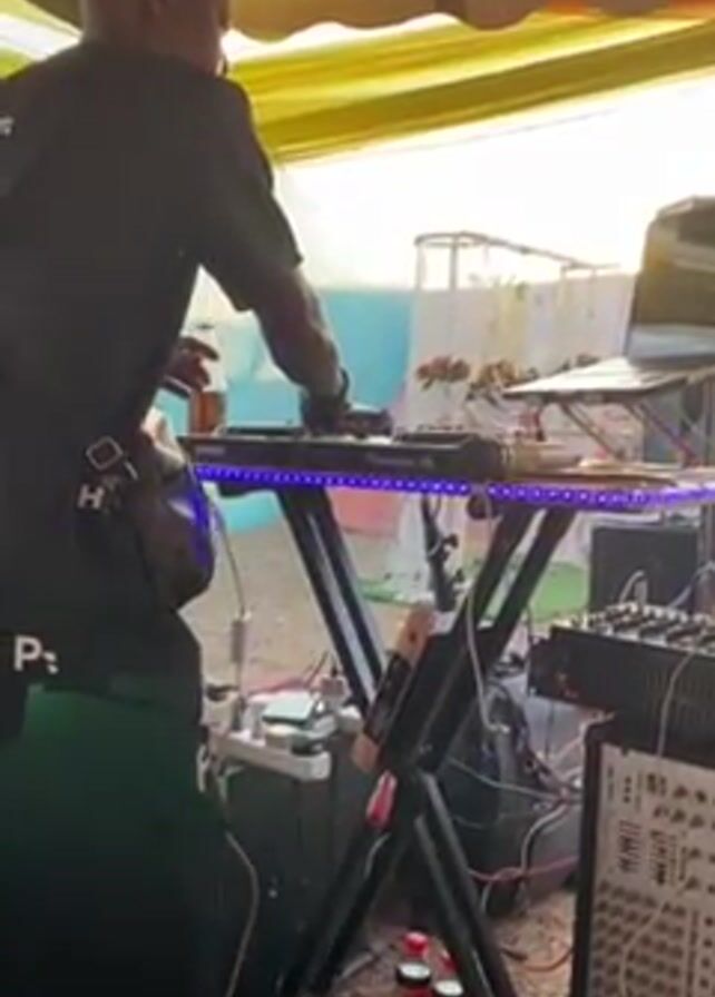 DJ operating his equipment under a tent. The DJ is a man wearing a black t-shirt and pants, with a small bag hanging on his side. He’s adjusting knobs and sliders on a Pioneer DJ console illuminated with blue LED lights. The console sits atop a black, foldable DJ stand. To the side, there’s a mixing console, speakers, and a laptop on a stand. The tent is decorated with yellow and white draping, and there are some Coca-Cola bottles placed near the equipment. You can see glimpses of an outdoor area through the tent, including people and a sign that reads “DJ LEASH GWASH.” The camera angle shows the DJ from the back and side as he focuses on his set-up.