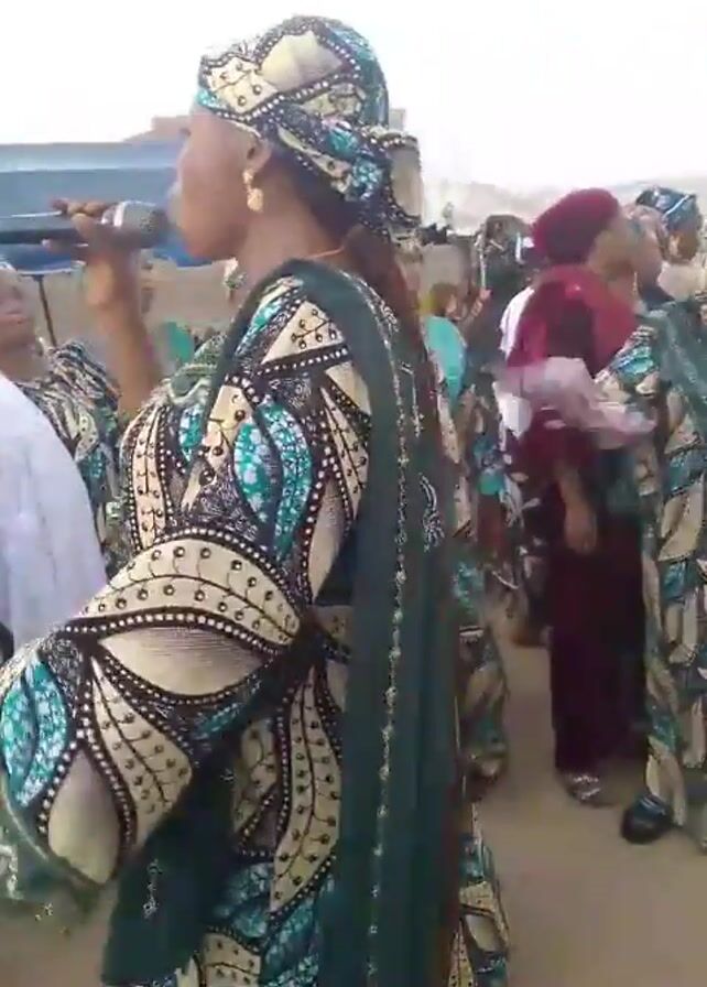 group of women, possibly at an event, singing or chanting into a microphone. Most of the women are wearing matching or similar dresses with a pattern of blue, green, white, and brown. One woman is holding a microphone and appears to be leading the group. They are outdoors, possibly in a grassy area. The backdrop includes what appears to be a building or tent structure. The quality of the video is somewhat shaky.