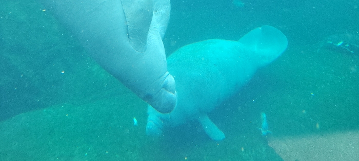 The scene depicts an underwater environment, an enclosed aquatic exhibit, located within the city of Saint-Mandé, France. Two manatees are present. The primary subject, a grey-skinned manatee, occupies the upper left foreground, with its snout and the anterior portion of its body partially visible. Its skin exhibits a textured appearance. A second, smaller manatee is positioned in the mid-ground, slightly to the right of the first, fully visible, swimming to the right with its body, flippers, and tail discernible. The water is greenish-blue, appearing somewhat murky with numerous small, light-colored particles suspended throughout. Small, dark fish are visible in the background and foreground, moving independently. The bottom of the tank, dark and indistinct, is visible in the lower right quadrant. No human subjects or direct interactions between the manatees are observed.