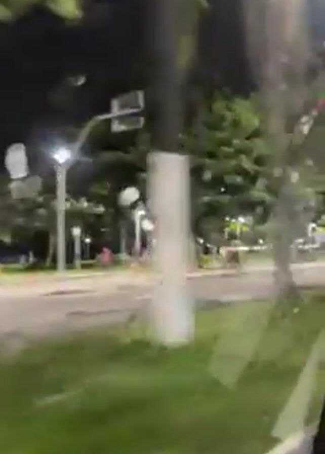 The video, shot from inside a moving vehicle at night, shows a street with sparse traffic and trees