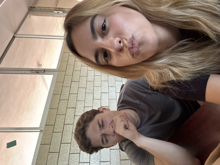 Two individuals are seated indoors in Chablekal, Mexico, at what appears to be a dark red-brown table. The individual on the right, a female with light-toned skin and long blonde hair, directly faces the camera with pursed lips. She wears a dark short-sleeved top. The individual on the left, a male with light-toned skin and short brown hair, is caught mid-yawn, with his right hand covering his mouth and his eyes squinted. He wears a grey short-sleeved t-shirt. The background consists of a light-colored brick wall, above which are large windows with metal frames. A small green rectangular object is adhered to the upper left windowpane, and a window latch is visible on a central frame.