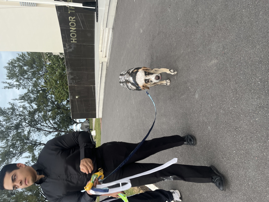 The image depicts an outdoor scene at the Heroica Escuela Naval Militar in Antón Lizardo, Veracruz City, Mexico, identified by a dark marble-like monument wall displaying "HONOR TH" in gold lettering. A male individual, appearing to be a young adult with dark hair, is visible from the waist up. He wears a long-sleeved black button-up shirt, black trousers, and black dress shoes. His left hand holds a dark blue leash, which is attached to a medium-sized dog walking in front of him. The dog has light-colored fur with prominent black and white markings resembling a skeletal pattern on its body and face, and its tongue is slightly visible. The man also holds white and yellow ribbons or fabric in his left hand. A partial view of a second person's leg, wearing a white sneaker and dark pants, is visible on the far left. The subjects are positioned on a dark paved surface. In the background, beyond the monument wall, are multiple green trees under an overcast sky, with a light-colored building partially visible to the right.
