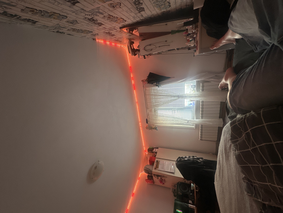 The image depicts the interior of a residential room, identified as being located in General Toshevo, Bulgaria, viewed from a low perspective, likely from a bed. An individual is present in the foreground, with only their bare feet and lower legs visible, resting on a dark surface under gray and dark plaid-patterned bedding. The room is illuminated by a continuous strip of red LED lights tracing the perimeter of the ceiling. A white, oval-shaped ceiling light fixture is centrally located but appears inactive. The walls are predominantly light-colored, with the wall on the right featuring white and gray brick-patterned wallpaper adorned with dark, stylized text or graffiti. To the left, a white, tall cabinet or refrigerator unit is visible, with assorted items, including a calendar and containers, placed on its top surface. Adjacent to this, a desk with a black computer monitor and a black office chair draped with a black and white plaid shirt are present. Centrally positioned, a window with horizontal white blinds and sheer white curtains allows natural light to enter. A white radiator is installed directly beneath the window. To the right of the window, a dark umbrella is suspended. Further right, a tall, unframed mirror leans against the patterned wall. A light-colored dresser or table stands below the mirror, displaying various small objects, including bottles and containers. A dark object, possibly a game controller, is also visible on top of this unit. The floor is covered with a dark material.