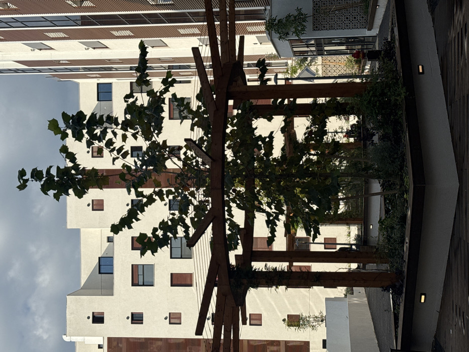 A white building with brown accents and varied window placements is viewed through a wooden pergola. Green foliage and trees partially obscure the building. The sky is visible in the upper left. A pathway with greenery is visible to the right of the pergola. The image is rotated sideways.