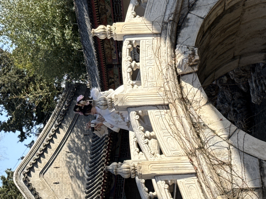 A woman in traditional dress stands on a stone archway. She wears floral hair accessories and a white gown with floral details. A camera is visible in her hands. The archway is intricately carved with lion heads and decorative latticework, covered in vines. Behind her is a traditional Chinese building with a multi-tiered roof. Trees are visible in the background, contrasting with the stone structures.