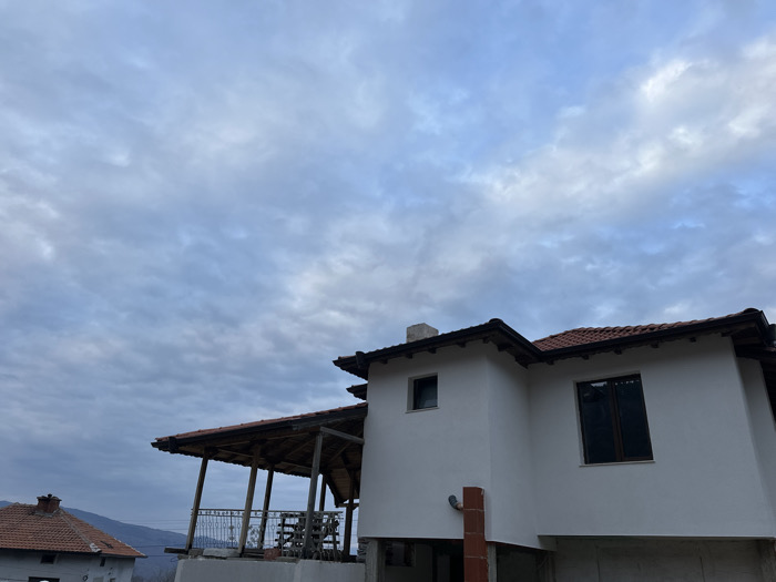 The image displays a residential street scene in Kolarovo, Bulgaria, under an overcast sky. The primary subject is a two-story building with white stucco walls and a multi-pitched roof clad in terracotta tiles with dark brown eaves. A light-colored chimney extends from the roofline on the left side. The building features a smaller square window on its upper left facade and a larger rectangular window with dark glazing on the upper right. A red-brown vertical pipe or conduit is affixed to the lower left exterior wall. The ground level of this building appears to be an unfinished concrete foundation or basement. To the left of the main building, an attached open-air structure, likely a balcony or terrace, is visible. It has a wooden post-and-beam support system and is topped with a roof similar in style to the main building. A decorative metal railing spans the edge of this structure. Partially visible within this area are indistinct objects, possibly building materials or outdoor furnishings. In the lower left quadrant of the image, a portion of a separate, older building with a red terracotta tile roof and lighter walls is present. The background reveals a distant, hazy mountain range beneath the heavily clouded, light blue-grey sky. No individuals are visible.