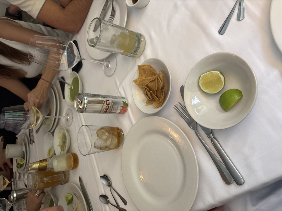 The image depicts a dining table set for a meal, covered with a white tablecloth, located in Naucalpan de Juárez, Mexico. Three individuals are partially visible: a hand in the upper left quadrant, a person in a white top with hands on the table in the upper center-right, and an arm on the far right. No direct interactions between individuals are depicted. Numerous objects are arranged on the table. Beverages include a gold-foil-wrapped beer bottle containing a light amber liquid, positioned next to a clear glass mug holding a similar liquid and ice. A tall glass contains a dark amber liquid with ice. An open silver aluminum can, labeled "SUNDET" with a strawberry graphic, stands upright. Two clear stemmed wine glasses are present; one contains white wine, the other is empty. A small, clear glass tumbler holds a light yellow liquid and ice. Food items consist of a small white bowl filled with tortilla chips. Multiple lime segments are visible: a lime wedge on a plate in the upper left, a lime wedge in a small white bowl in the upper center, and a lime half and a lime wedge in another small white bowl in the lower right. Tableware includes several white ceramic plates, some showing minor food remnants, and one large empty white dinner plate. Silverware, consisting of forks, knives, and spoons, is arranged beside the plates. A small white cup containing a dark condiment is visible on the right. The presence of both full and partially consumed food and beverage items suggests a meal is either in progress or has recently concluded.