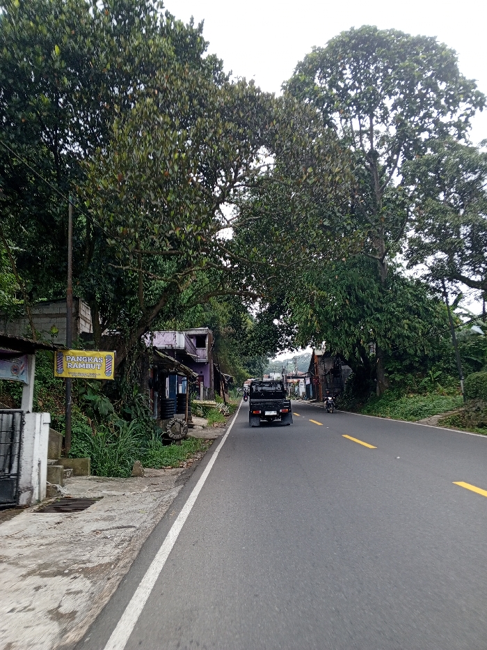 The image depicts a two-lane asphalt road traversing a verdant, tropical environment. On the left side, a concrete sidewalk with a drainage grate transitions into an unpaved shoulder with dense green vegetation, leading up a slight incline. A prominent yellow rectangular sign, marked "PANGKAS RAMBUT" (Barbershop) and featuring a barber pole graphic, is affixed to a pole on this embankment. Behind the vegetation and sign, several modest, somewhat dilapidated structures are visible, including one with a purple-colored upper story and another with a dark tire leaning against it. A gray concrete block wall is partially obscured by foliage further back. The road features a solid white line on its left edge and broken yellow lines delineating the center of the pavement. A black pickup truck, observed from the rear, travels away from the viewer in the right lane. Further down the road, a motorcycle is also moving away from the viewer. Both sides of the road are densely lined with tall, leafy trees, forming a partial canopy overhead. More rudimentary structures are discernible through the trees on the right side of the road in the mid-ground. In the far distance, under an overcast sky, mountainous or hilly terrain is visible between the tree lines. No individuals are distinctly present in the foreground or mid-ground. The linguistic content on the sign indicates a setting in an Indonesian or Malay-speaking region.
