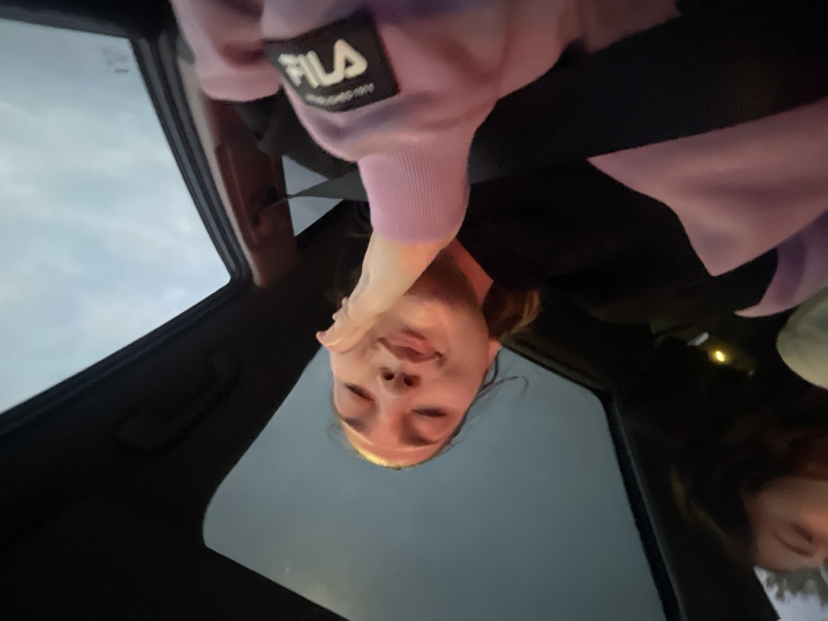 The image depicts the interior of a vehicle, likely a car, with a partially visible panoramic sunroof revealing an overcast sky. Two individuals are prominently featured, and a third is partially visible. In the foreground, a person, likely female, wears a black and lavender color-block long-sleeved top or sweatshirt with a black square patch on the right sleeve displaying a white "FILA" logo. This person's right hand is gently cupping the left cheek of another individual. The second individual, positioned slightly to the left, also appears female, with light skin and dark hair pulled back. Her face is illuminated by a warm light source, casting a soft glow. Her eyes are closed or heavily squinted, and her lips are slightly parted with a hint of her tongue visible, suggesting a playful or mock-disgruntled expression in response to the touch. She is wearing a dark-colored top. A third person's head and shoulder are partially visible in the bottom-left corner of the frame, appearing to have dark hair. The interior of the vehicle is dark, with an ambient interior light visible as a warm glow in the lower-middle portion of the image. The exact location within Vendenheim, France, cannot be determined from the visual information provided in the image.
