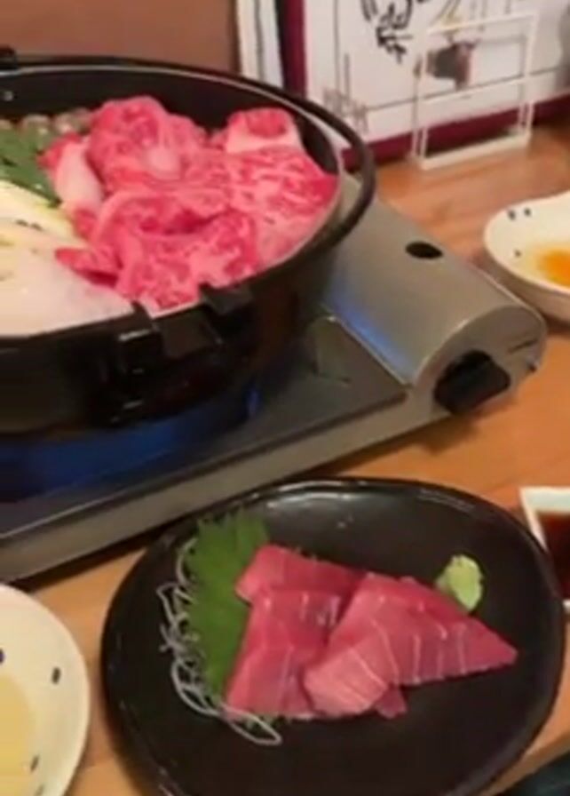 table in a restaurant with several dishes. There is a portable gas stove with a black pot on it, which contains sukiyaki with beef, vegetables, and noodles. To the right of the pot is a black plate with slices of tuna sashimi garnished with wasabi and a green leaf, along with a small dish of soy sauce. Next to the pot on the left is a bowl with a raw egg and another bowl of white noodles. The table is made of wood. Some people are visible behind the table.