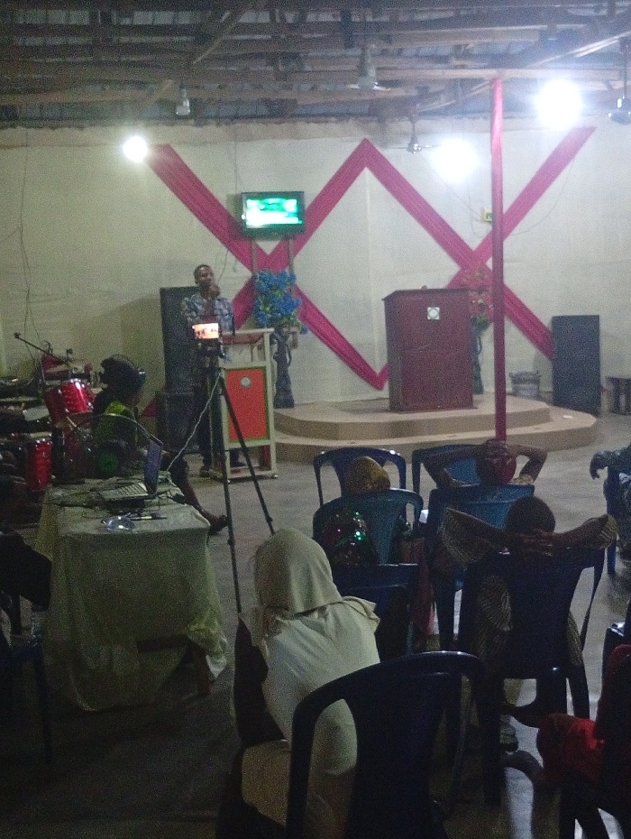 Inside a church, a man speaks from a podium on a raised stage, next to a television screen adorned with pink fabric in an X shape. Other individuals sit in plastic chairs facing the stage. A table with a laptop and sound equipment sits to the left. Drums and other musical instruments are partially visible on the left side of the room.