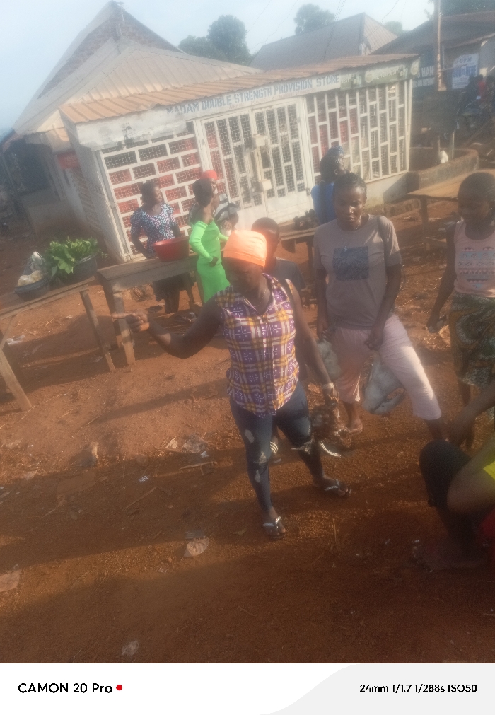 The image depicts an outdoor commercial scene in Markurdi, Nigeria, characterized by reddish-brown dirt ground and several individuals