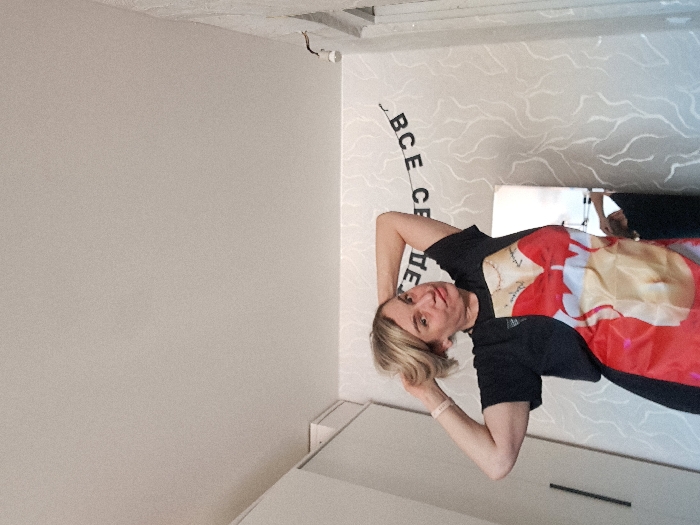An indoor, waist-up portrait captures a Caucasian female in what appears to be a residential setting within Elektrostal, Russia. The subject, with blonde hair, is centered in the frame, posing with both hands touching the back of her head, adjusting her hair. She wears a black short-sleeved t-shirt and a red-and-tan novelty apron designed to resemble a corset over her clothing. A light-colored wristband is visible on her left wrist. Her expression is a slight pout, directed towards the camera. The background features light-colored walls; the left wall shows part of a light-colored wardrobe with dark vertical handles, while the right wall is adorned with a textured, wavy pattern wallpaper. A banner with dark, reversed Cyrillic text ("ВСЕ СЕ" visible) hangs on the right wall. Below the banner, a tall, rectangular mirror reflects a portion of the room and a dark form, likely the subject's lower body or another individual. Above the mirror, a simple wall-mounted light fixture with a visible bulb is present. The ceiling is plain and light-colored.