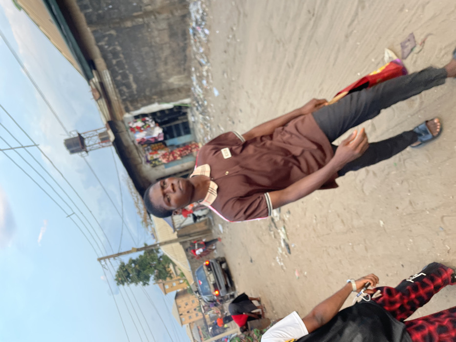 A young man stands on a street, wearing a brown polo shirt, dark pants, and sandals. He holds a colorful bag in his hand. The street scene includes a building with fabric on display, overhead wires, and a water tower. There is a car and people visible in the distance. The ground appears to be sandy or dirt, and there is trash along the side of the road. A person wearing a white t-shirt and checkered pants is visible in the bottom right corner. The photograph has a tilted perspective.