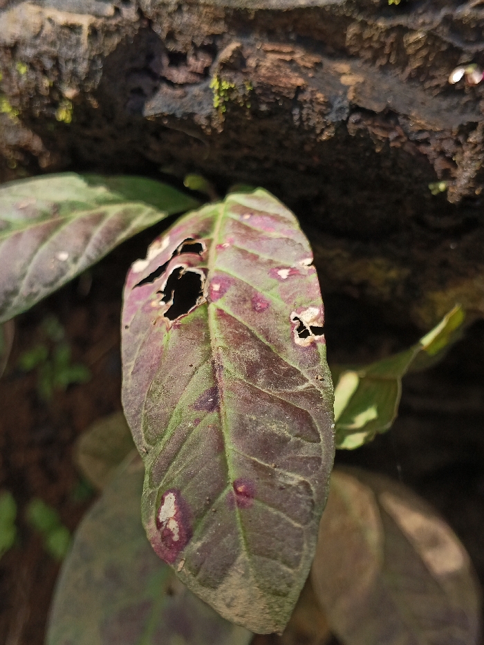 A close-up shows a diseased leaf. Dark purple and green veins run through its surface, punctuated by holes and light spots. The leaf edges are jagged and incomplete. It sits against a backdrop of a dark, mossy tree trunk and scattered green foliage. The image portrays decay and vulnerability in nature.