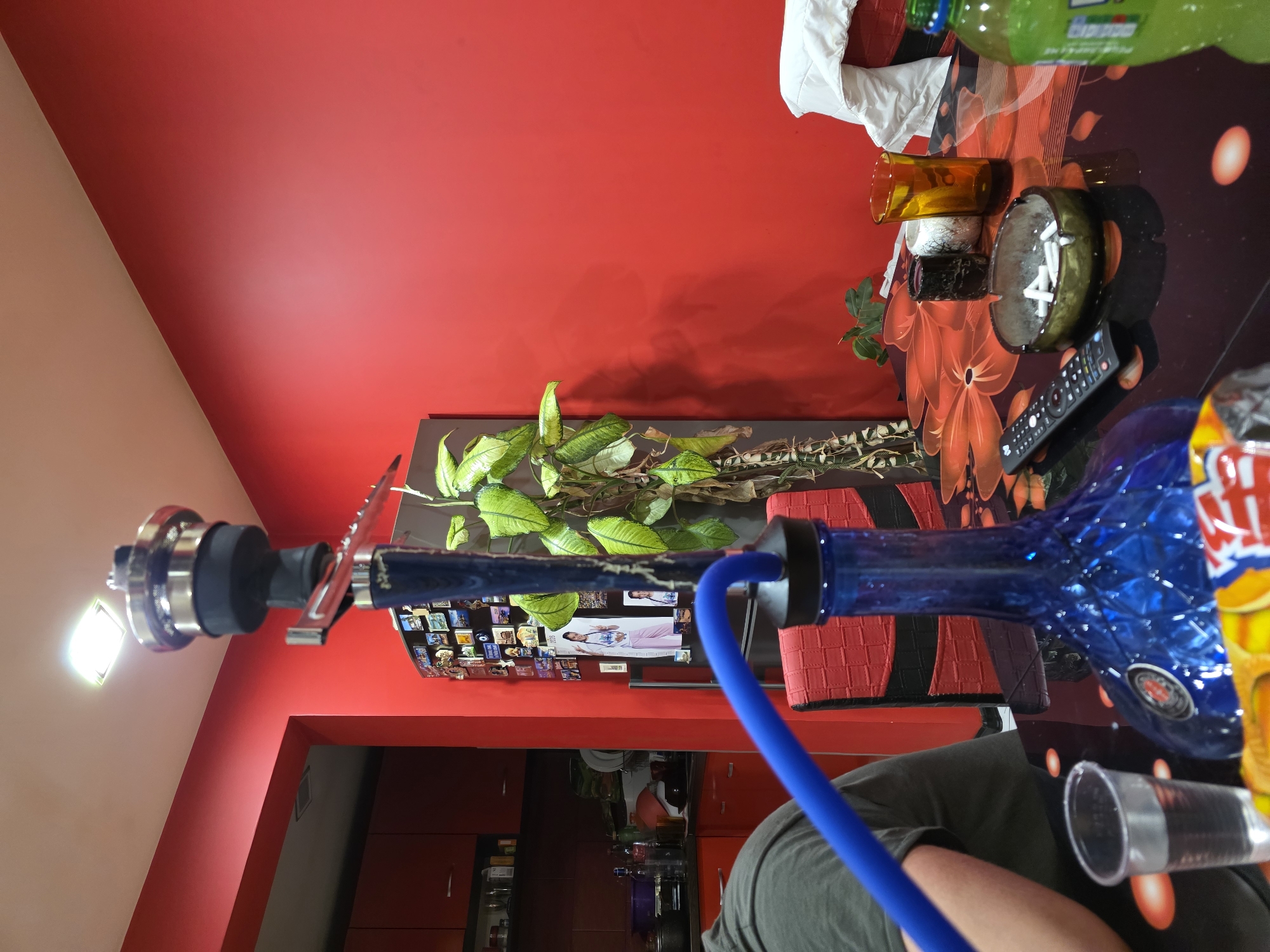 - "A hookah is positioned on a dark, patterned table, with a blue hose and a clear plastic cup nearby" by FM-84xkn1, licensed under CC BY 4.0