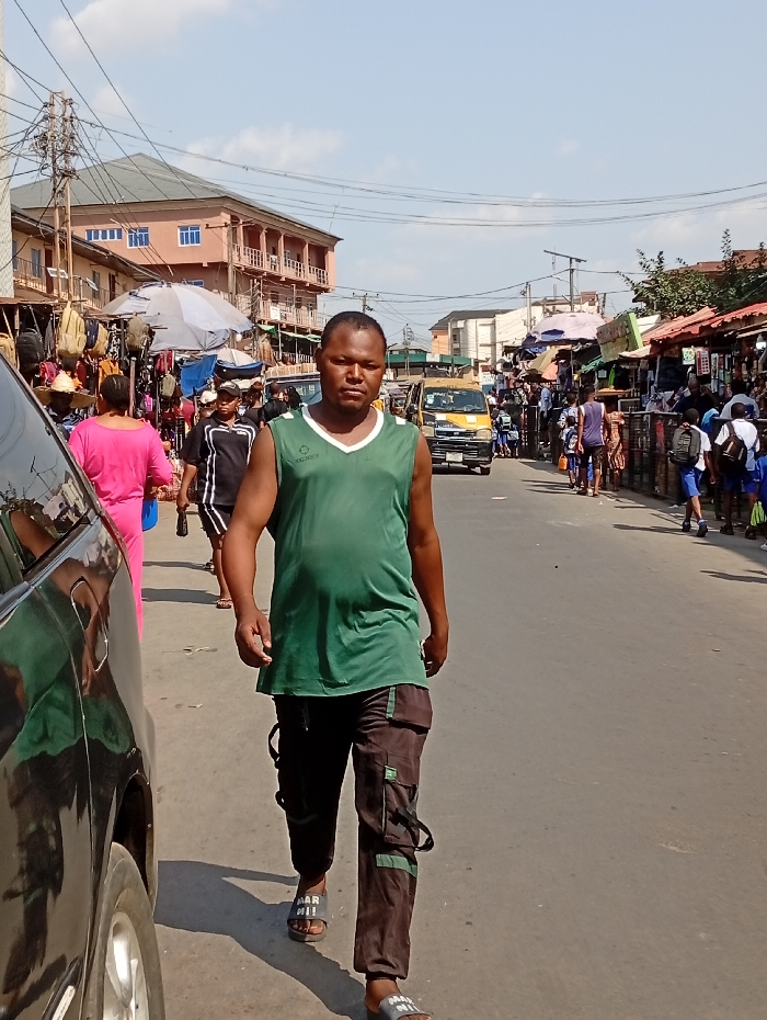 - "A man in a green tank top and brown cargo pants walks towards the camera on a busy street" by FM-KfFGa2, licensed under CC BY 4.0