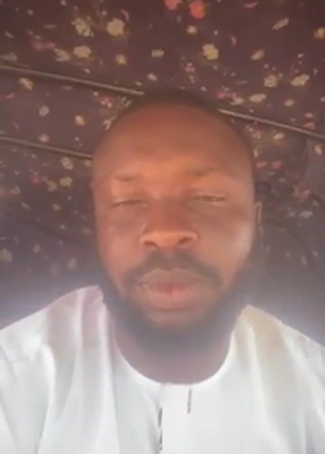 A man with dark skin and a beard is sitting and looking at the camera. He is wearing a white shirt. The background behind the man is covered with fabric with a floral pattern. He holds up two fingers in a "peace" sign, and has a yellow cloth in his hand. He smiles at the camera.