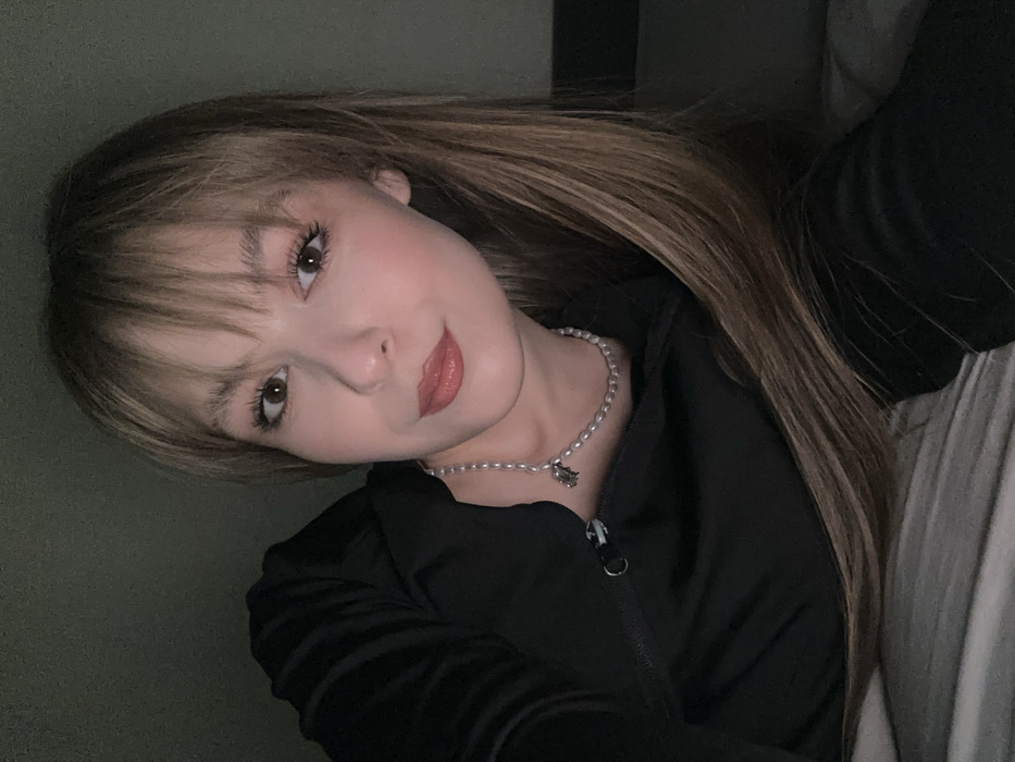 A young woman with light brown hair and bangs is angled in a selfie. She wears a black jacket and a delicate pearl necklace with a charm. Her makeup is subtle, enhancing her eyes and lips. The background is dimly lit, adding to the relaxed, intimate feel of the photo. Her gaze is direct, creating a sense of connection with the viewer.