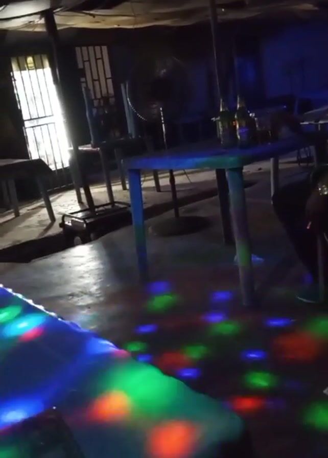 inside of a dimly lit bar with colorful disco lights dancing on the tables. There are plastic tables and chairs. A bottle of water and a glass are on the table in the foreground. A TV screen shows a video in the background. There is a window with bars. The ceiling looks unfinished. Music is playing.