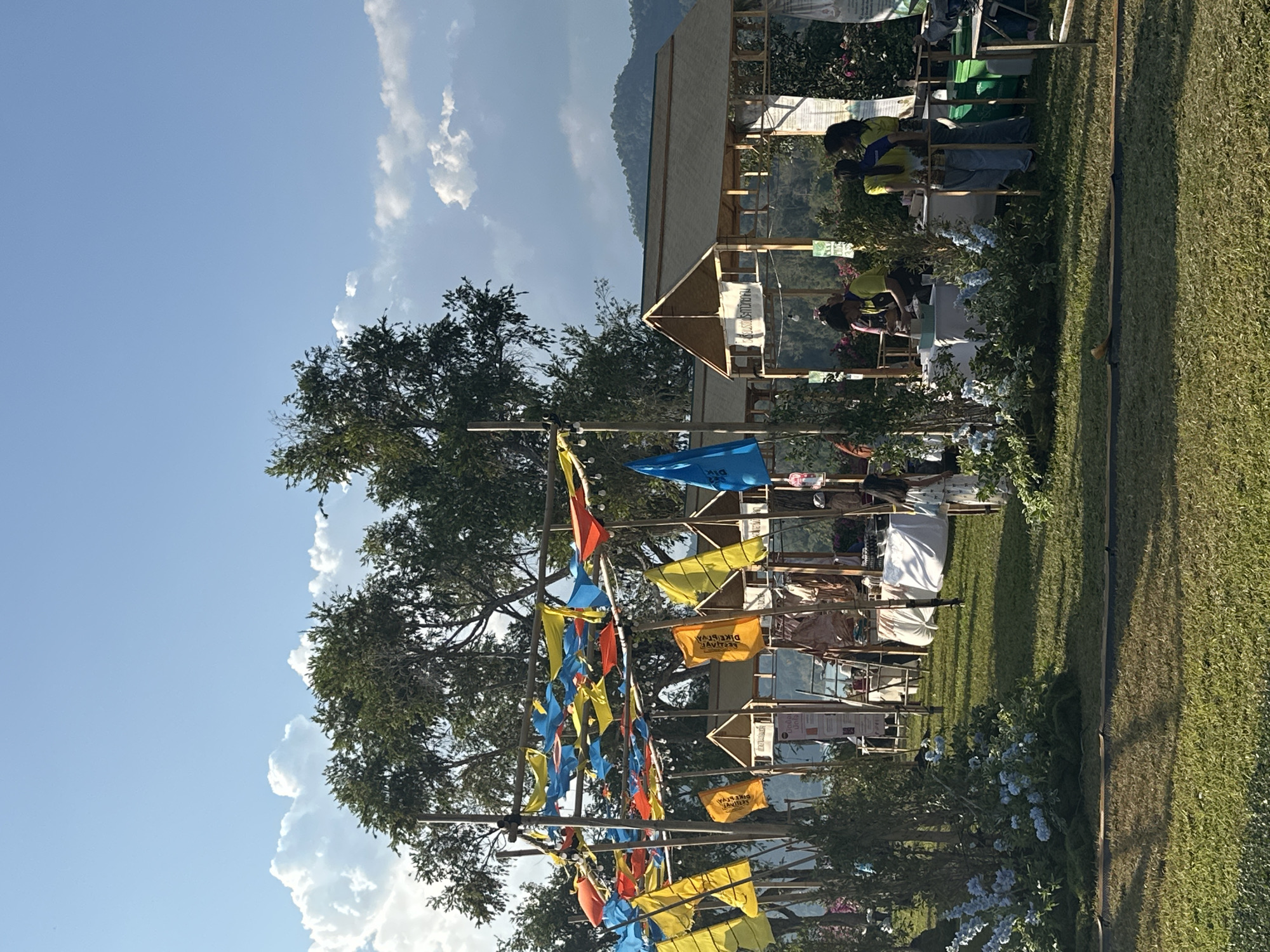 vibrant outdoor scene in Khao Phang, Thailand. A decorative structure made of bamboo poles is adorned with numerous colorful flags in yellow, blue, and orange. Behind this, people are setting up and looking at various displays on a grassy lawn. Further back is a series of small wooden stalls with peaked roofs. The backdrop includes a tree, a building structure, and a mountain range under a partly cloudy blue sky.