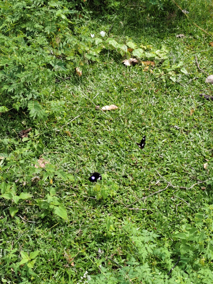 Lush green vegetation dominates the scene, a diverse mix of grasses, ferns, and other plants covering the ground. Two black and white butterflies are noticeable amidst the greenery, one resting on the lower left and another slightly higher, positioned near the center. Scattered leaves and occasional patches of dried vegetation are visible, adding a touch of texture to the ground cover. Overall, it portrays a natural setting rich with plant life and some wildlife.
