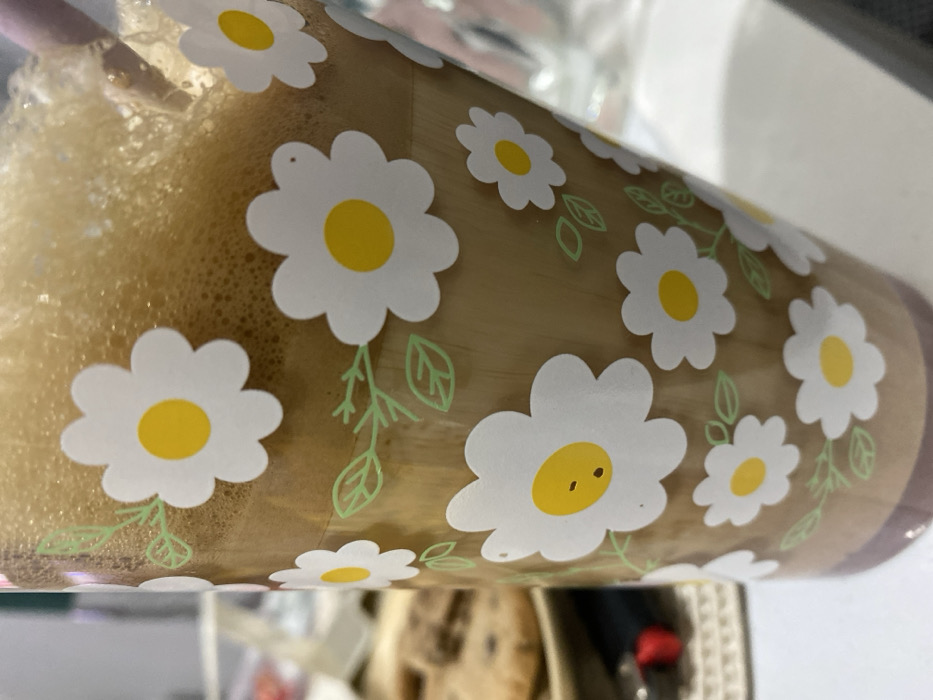A glass or cup decorated with white daisy patterns, each with a yellow center and green leaf accents, contains a frothy, brown beverage