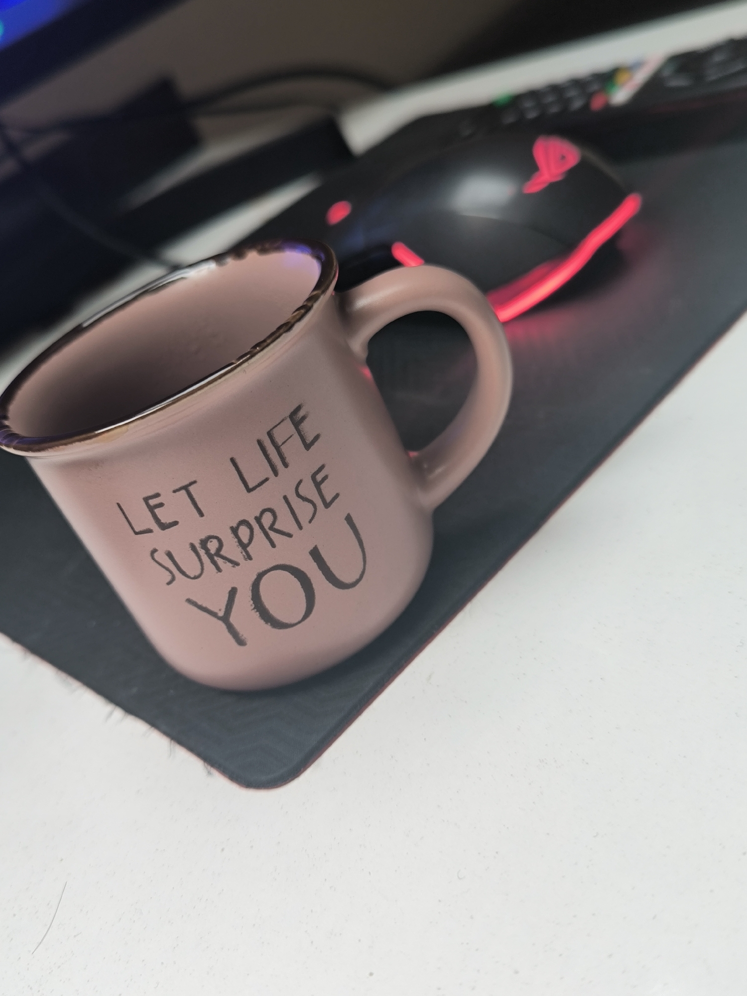 This image depicts an indoor desktop scene, located in Sofia, Bulgaria. The primary subject is a light brown ceramic mug with a dark brown rim and handle, positioned on a dark gray, rectangular mousepad. The mug bears the black capitalized inscription: "LET LIFE SURPRISE YOU." Behind the mug, partially visible on the mousepad, is a black gaming mouse emitting red LED illumination. Further in the background, a black keyboard with multi-colored keys and additional dark electronic equipment or cabling are present, appearing out of focus. The lower right portion of the frame reveals a white desk surface, exhibiting minor surface particulate. No individuals are present. The scene is illuminated by ambient indoor light, complemented by the distinct red glow from the mouse.