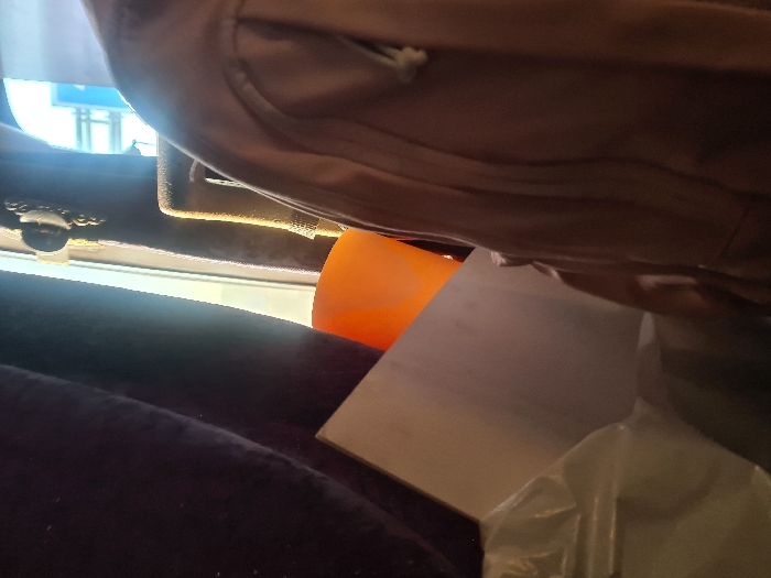- "A close-up view shows a tan backpack above a partially visible orange object" by FM-9VsWL2, licensed under CC BY 4.0
