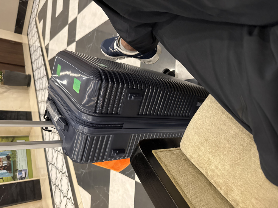 black suitcase sitting on a black and white checkered floor next to a tan couch with a black frame. A person is wearing blue and white sneakers and dark pants. There are two green stickers on the suitcase. The floor tiles are long rectangles. Part of the suitcase handle is visible.