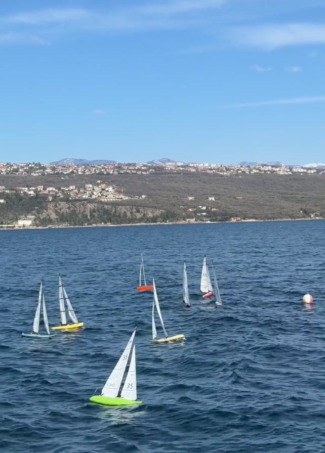 small fleet of radio-controlled sailboats on a blue body of water under a sunny sky with a coastal cityscape in the background
