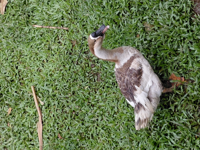 A gray goose lies dead on green grass. Its dark head and outstretched neck are visible. The goose is a mix of white, gray, and brown feathers. Its orange webbed feet are near the bottom right of the frame. Stray twigs are scattered around the bird on the grass. The setting appears to be outdoors.