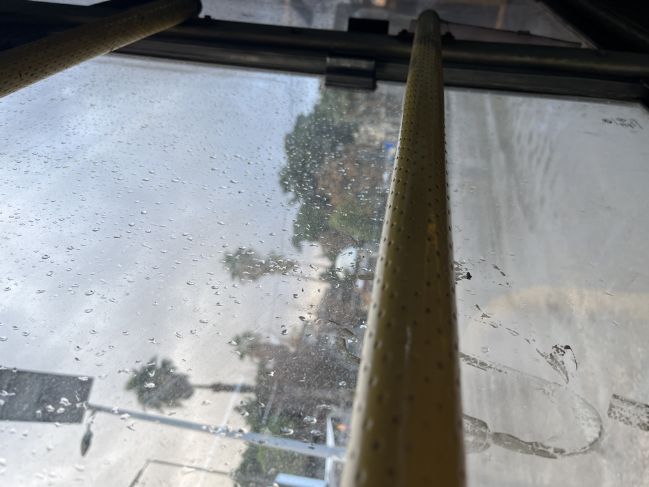 A rainy day view from inside a vehicle, likely a bus or tram. Raindrops cling to the window, obscuring the urban landscape outside. Palm trees and buildings are visible in the blurred background. A vertical yellow pole with small holes runs from top to bottom of the frame, obstructing some of the view. Another similar pole is seen in the upper left corner. Metal framework surrounds the window.