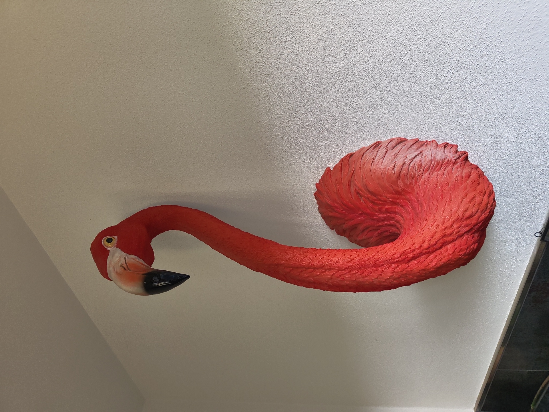 - "A three-dimensional sculpture of a flamingo's head, neck, and upper chest is mounted on a light-colored, textured wall in Mettlach, Germany" by FM-uXjJw1, licensed under CC BY 4.0