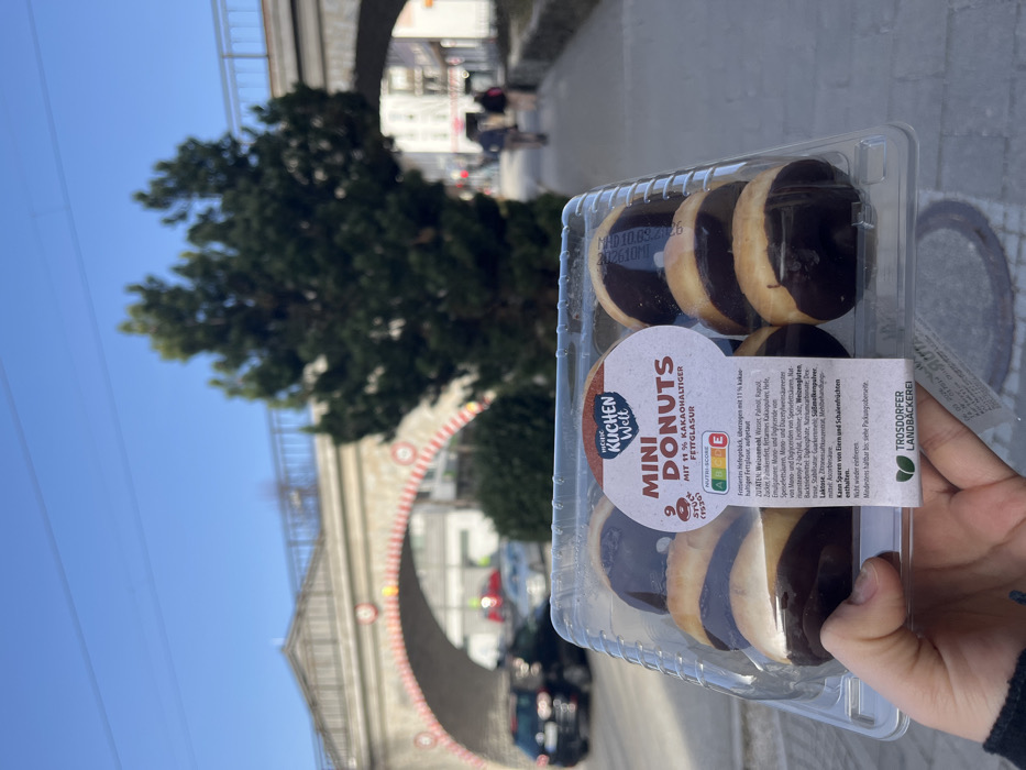 - "A human hand in the foreground holds a clear plastic container of nine "Mini Donuts" with chocolate glaze, labeled "KUCHEN WELT" and featuring a "Nutri-Score C" from "TROS DORFER LANDBÄCKEREI" by FM-i0Lrk2, licensed under CC BY 4.0