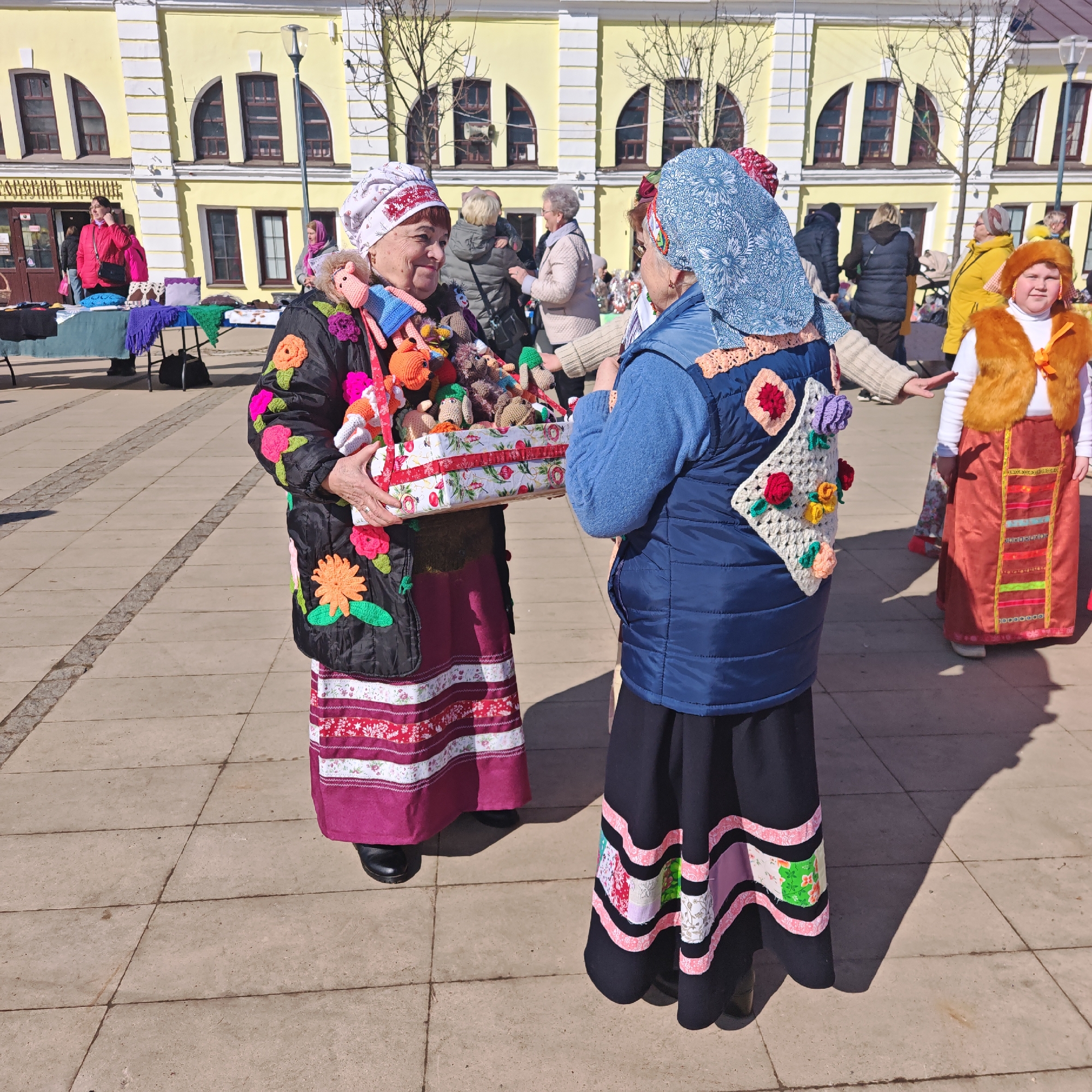 The image displays an outdoor market scene under bright sunlight in the city of Семибратово, Russia. In the foreground, two elderly women are interacting. The woman on the left, with a smiling facial expression, wears a white headscarf with red embroidered patterns, a black jacket heavily adorned with large, colorful crocheted flowers, and a long maroon skirt with horizontal patterned stripes. She is holding a decorative rectangular basket, wrapped with a red-and-white patterned ribbon, filled with numerous small, colorful crocheted dolls, some of which are also attached to her jacket. The woman on the right wears a blue headscarf with white floral patterns, a dark blue puffer vest over a blue long-sleeved top, and a long dark skirt featuring pink striped patterns and multi-colored fabric patches. Her vest displays a large white crocheted granny square patch decorated with small colorful crocheted flowers. Her right arm is slightly raised with an open palm, seemingly in a gesture while conversing with the woman on the left. In the midground and background, additional individuals are present. To the far right, a person is visible wearing an orange faux-fur hat and matching vest over a white shirt, paired with a long red skirt adorned with colorful vertical stripes. Other people are dispersed, some standing near market stalls draped with cloths displaying various handmade crafts. The background is dominated by a two-story yellow building with multiple arched windows and dark frames. Bare trees are visible, and the ground is paved with light-colored concrete or stone tiles, reflecting distinct shadows cast by the bright sun.